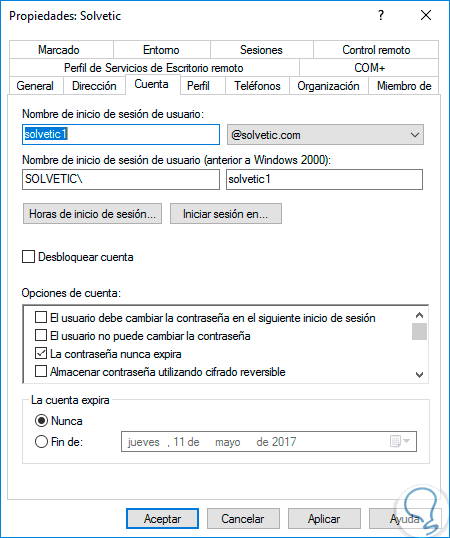 4. Cómo modificar los atributos del nuevo usuario en Windows Server 2016