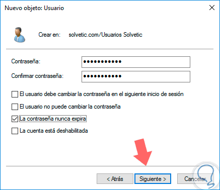 Allí definiremos la contraseña a asignar al nuevo usuario y establecer propiedades de la cuenta tal como solicitar cambio de contraseña, deshabilitar la cuenta, etc. Una vez registrados estos valores pulsamos en Siguiente y veremos un resumen del nuevo usuario a crear:
