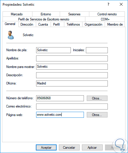 Como vemos contamos con múltiples pestañas que nos permitirán editar los valores del nuevo usuario tal como correo electrónico, teléfono, asignación de grupos, asociar archivos .bat creados para ejecutar automáticamente programas, establecer horarios de sesión, etc.