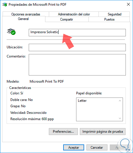 Daremos clic en la línea “Propiedades de impresora” y en la nueva ventana desplegada ingresaremos el nuevo nombre deseado. Una vez realizado, pulsamos en Aplicar y Aceptar para guardar los cambios.