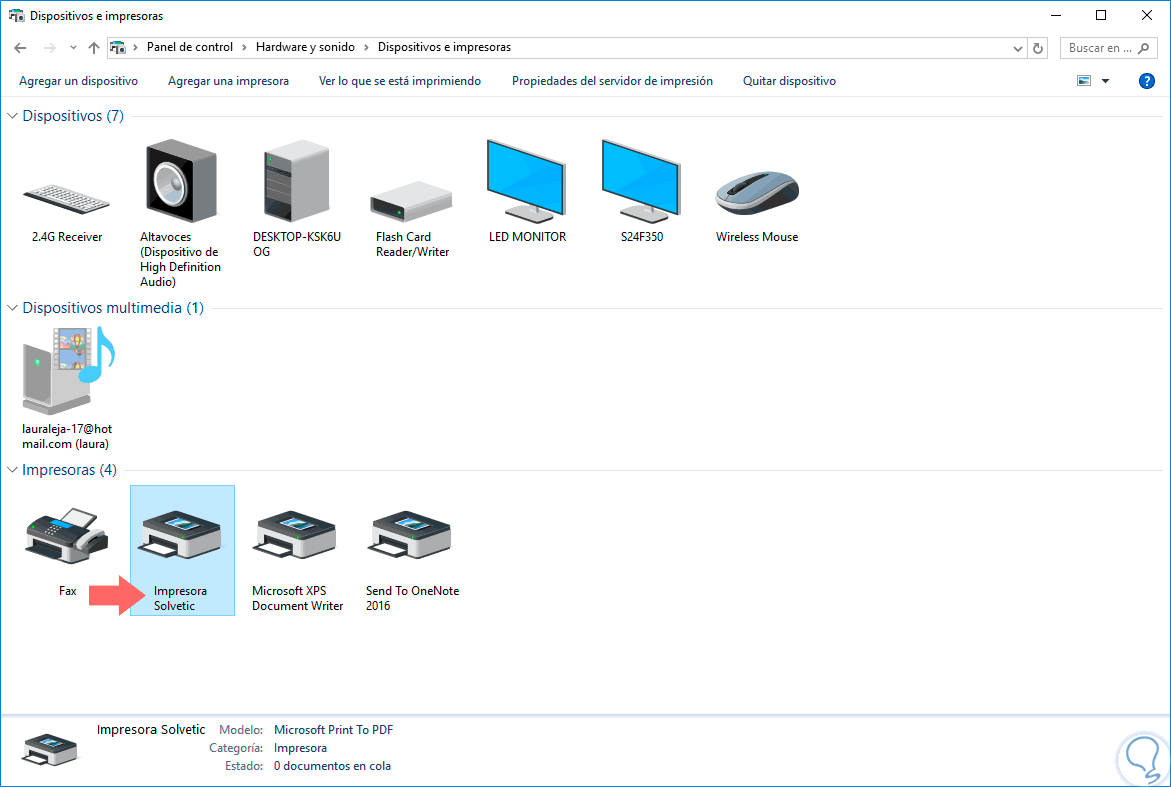 - Ir a la ruta Panel de control\ Hardware y sonido\ Dispositivos e impresoras.