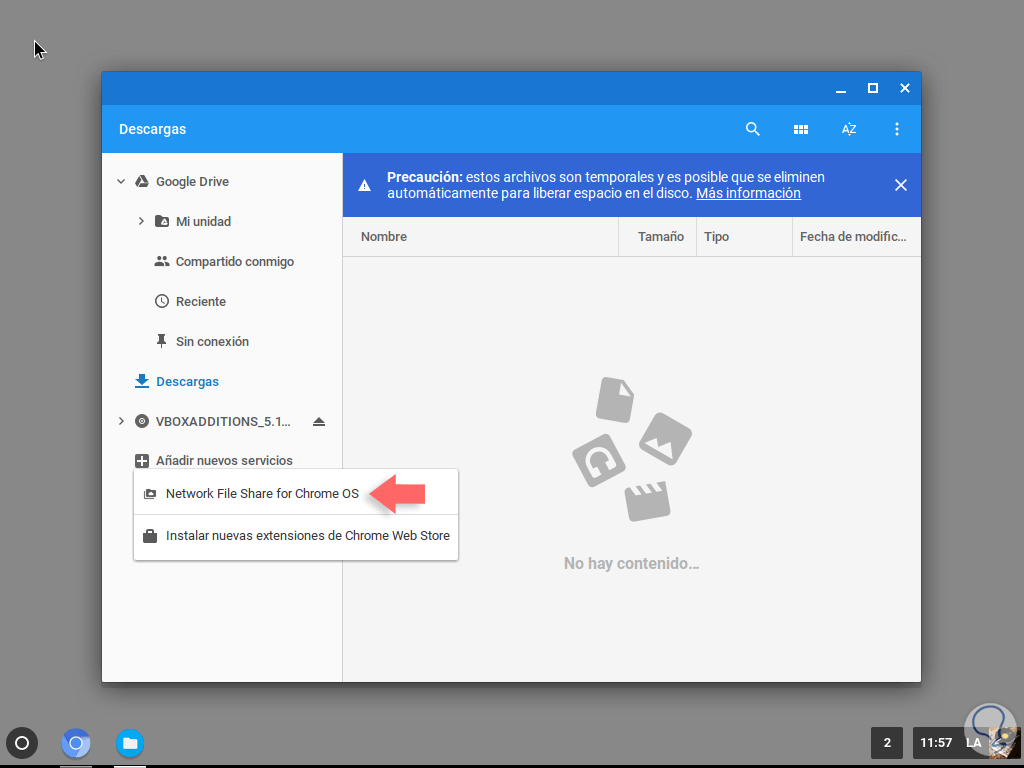 Allí pulsamos en el botón Archivos y se desplegará lo siguiente. Pulsamos en la línea Añadir nuevos servicios y en las opciones desplegadas seleccionamos Network File Share for Chrome OS: