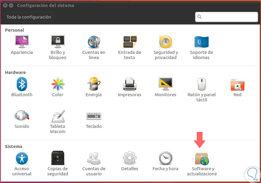 Allí elegimos la opción Software y actualizaciones y en la ventana desplegada realizamos los siguientes ajustes.Pulsamos en Cerrar.