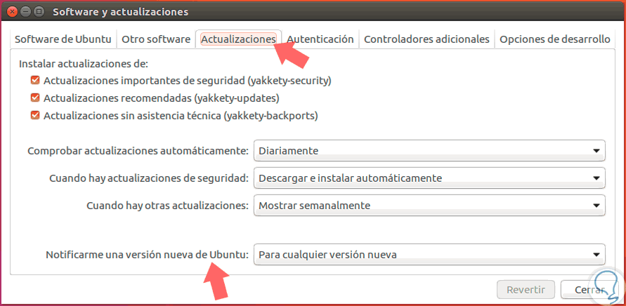 - En el campo Notificarme una nueva versión de Ubuntu definimos el valor para cualquier versión nueva.