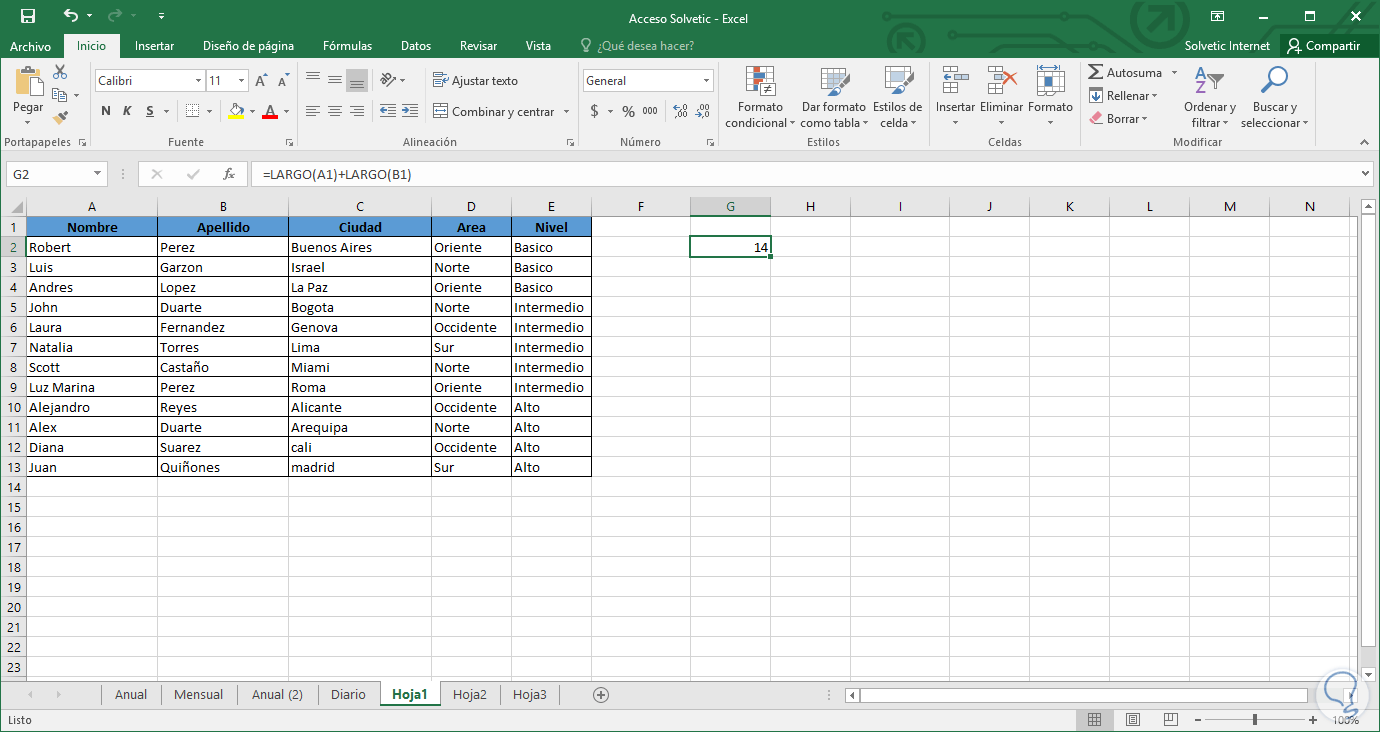 =LARGO(A1)+ LARGO (A2)+ LARGO (A3)… =SUMA(LARGO(A1);LARGO(A2)…Estas fórmulas nos permiten sumar pequeños rangos dentro de Excel 2016 y podemos usar distintas celdas para su resultado: