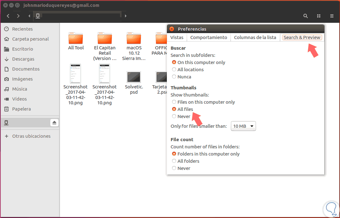 Allí debemos activar a que opciones tendrá acceso la cuenta. Abrimos una nueva ventana de Archivos y allí podremos visualizar en el costado izquierdo nuestra cuenta de Google con su respectivo acceso: