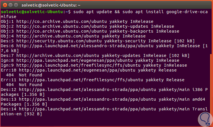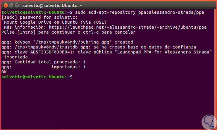 Una vez descargado e instalado el repositorio procedemos con la instalación de Google Drive Ocamlfuse ejecutando el siguiente comando: