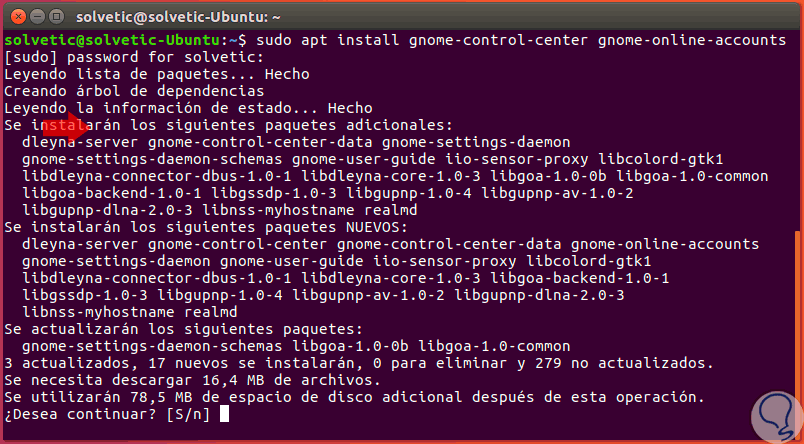 Esta es otra de las opciones disponibles en ambientes Linux para acceder con total seguridad a nuestro Google Drive y realizar los cambios necesarios. Para instalar dicha utilidad ejecutaremos el siguiente comando. Allí aceptamos la descarga y respectiva instalación de los paquetes del centro de control de GNOME.