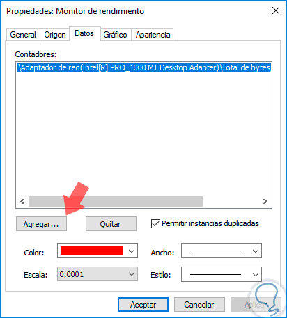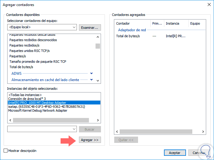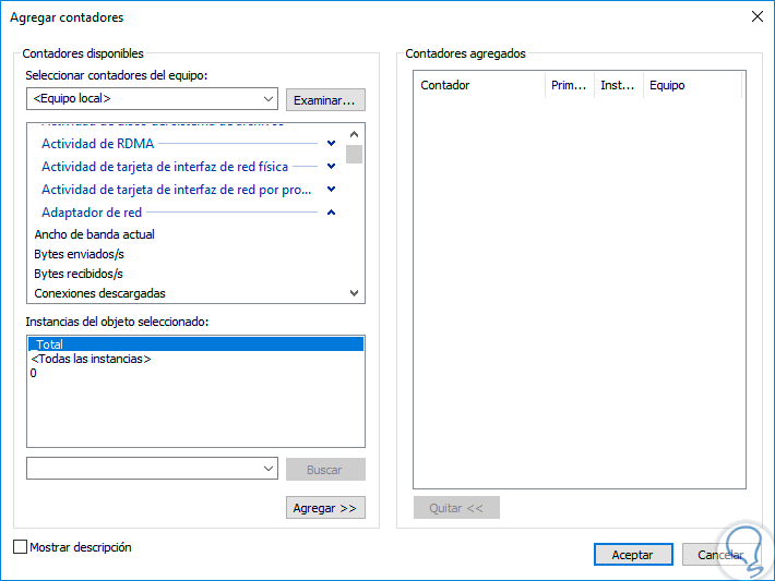 Debemos seleccionar uno o más valores a analizar, en este caso seleccionamos la opción Total de bytes y en el campo Instancias del objeto seleccionado debemos seleccionar la tarjeta o las tarjetas de red del servidor: