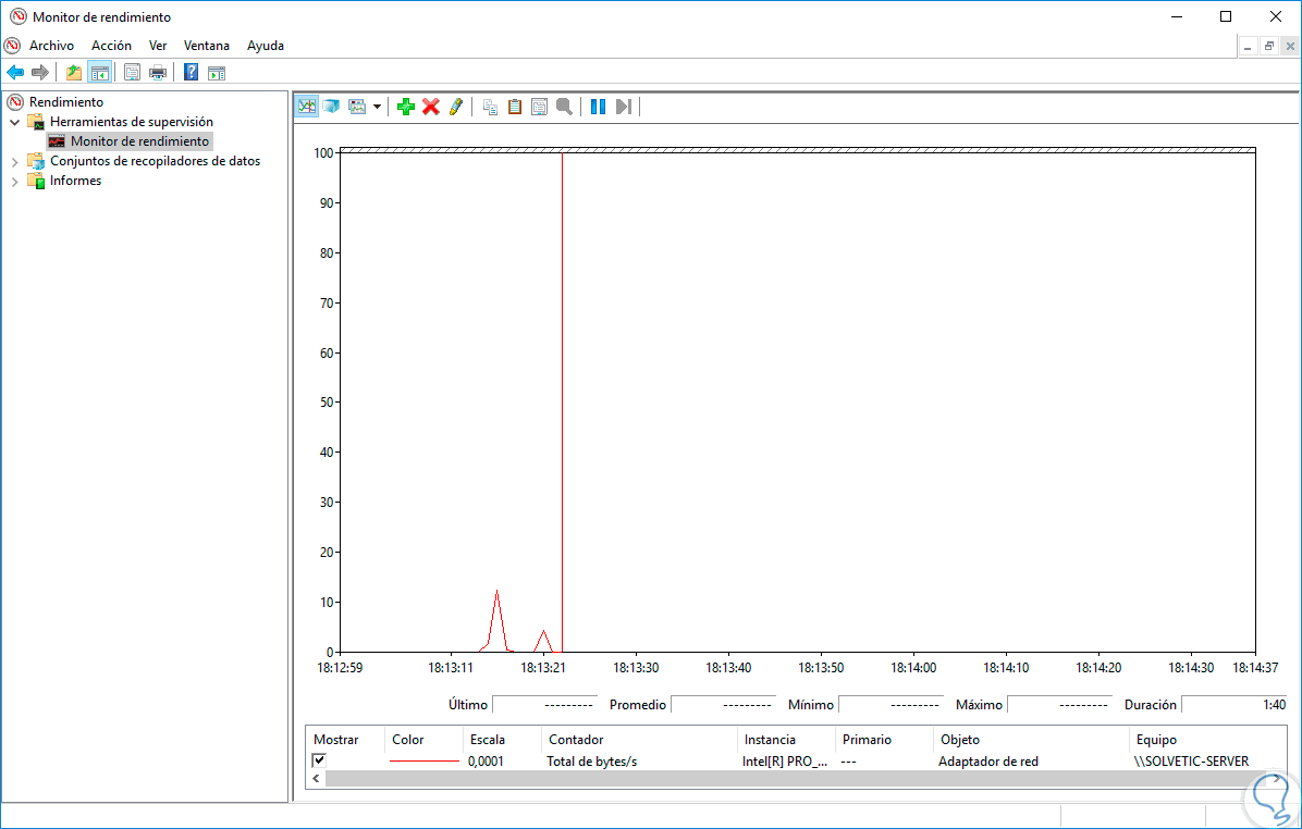 Al usar alguna de las opciones indicadas este será el entorno del monitor de rendimiento en Windows Server 2016: