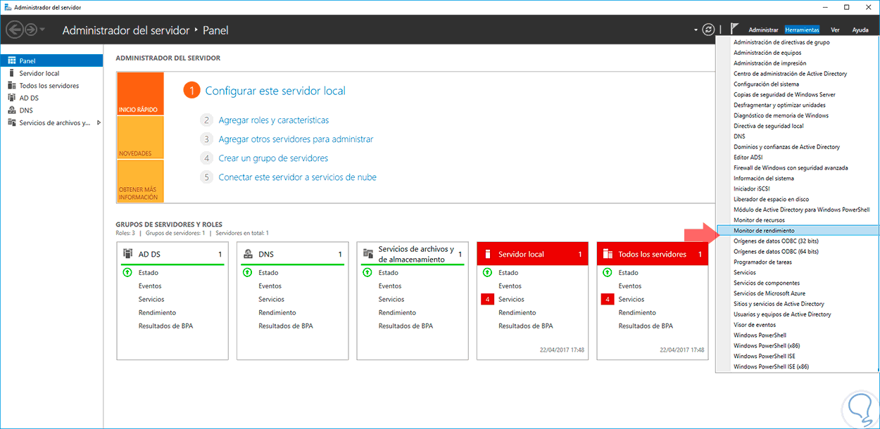- Ir al Administrador del servidor y allí vamos a Herramientas / Monitor de rendimiento.