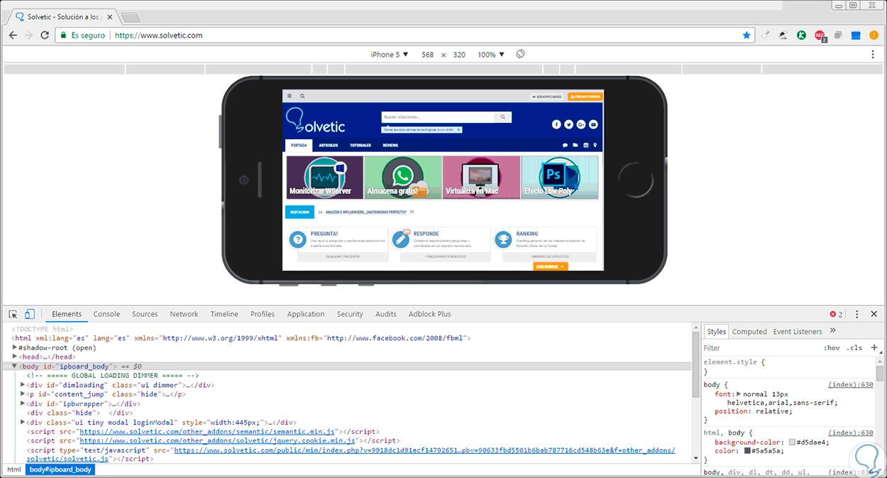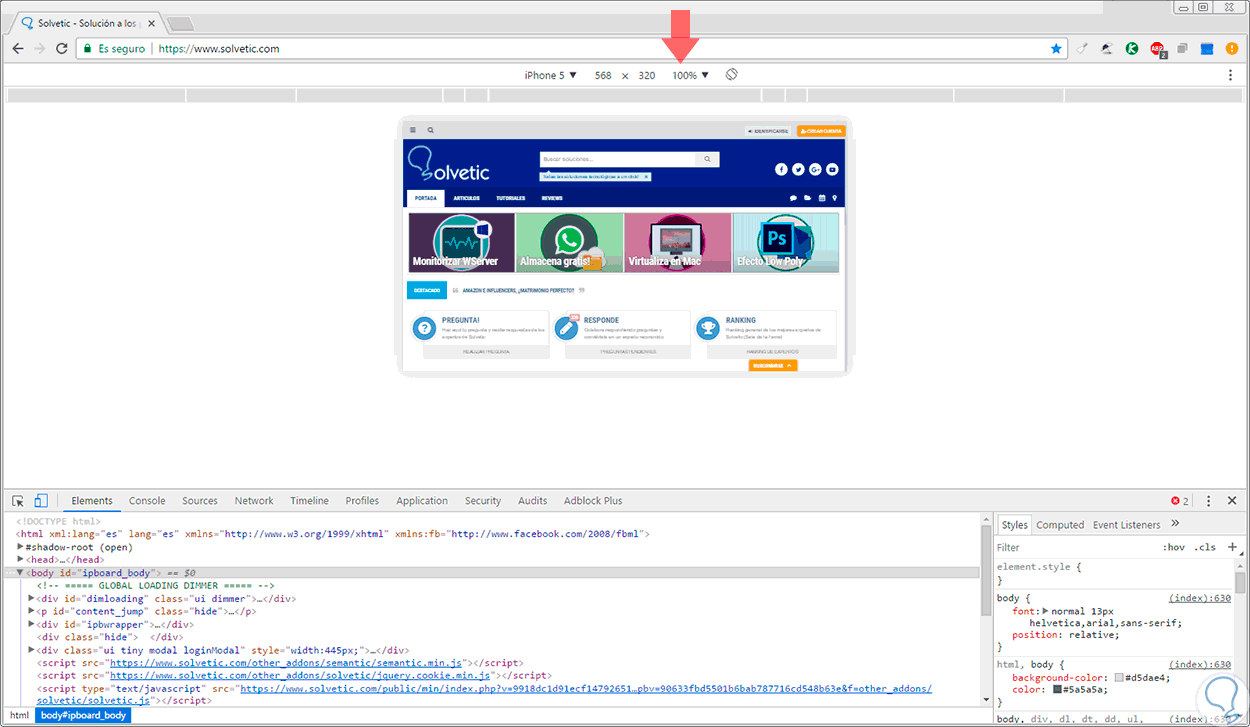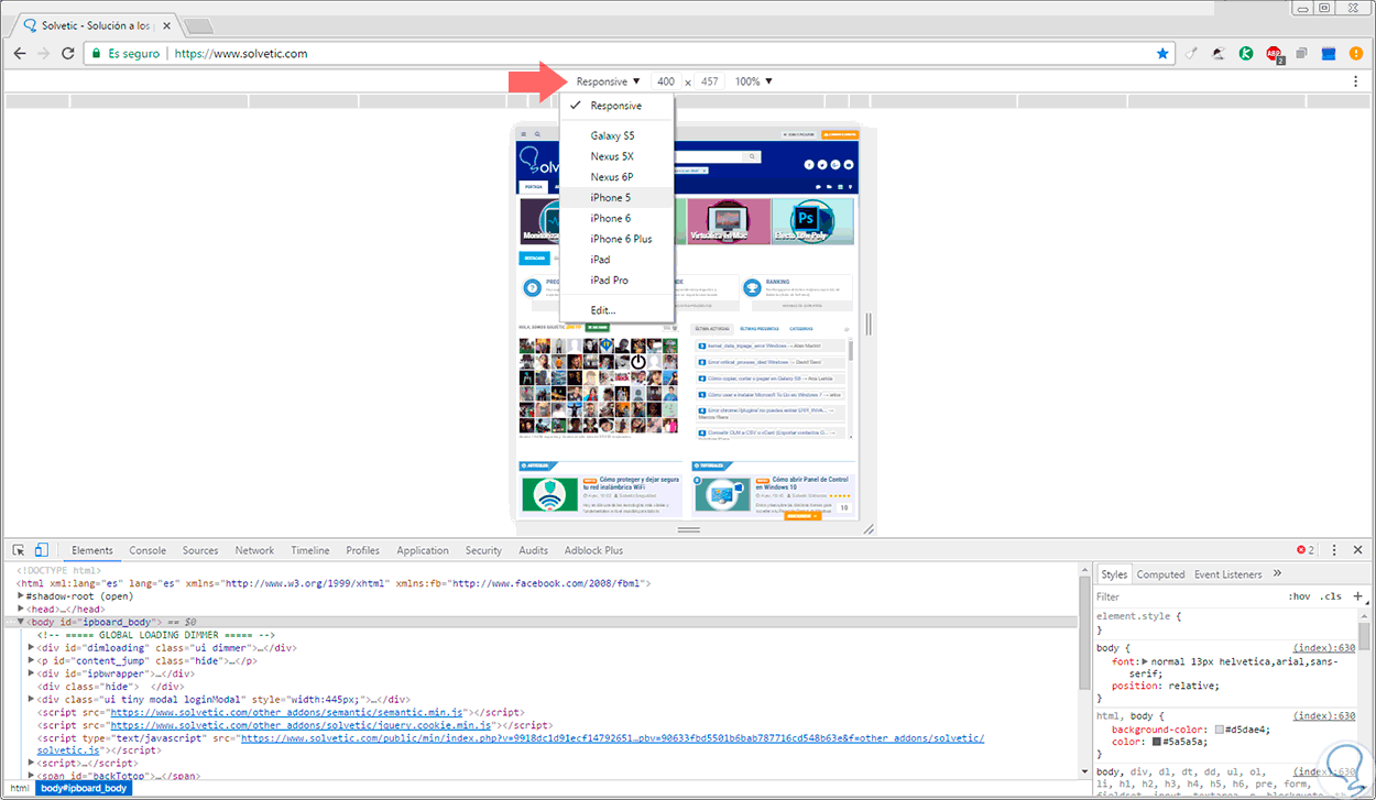 Veremos La siguiente ventana donde desplegamos las opciones del botón Responsive y allí seleccionamos un dispositivo: