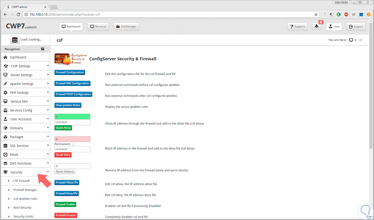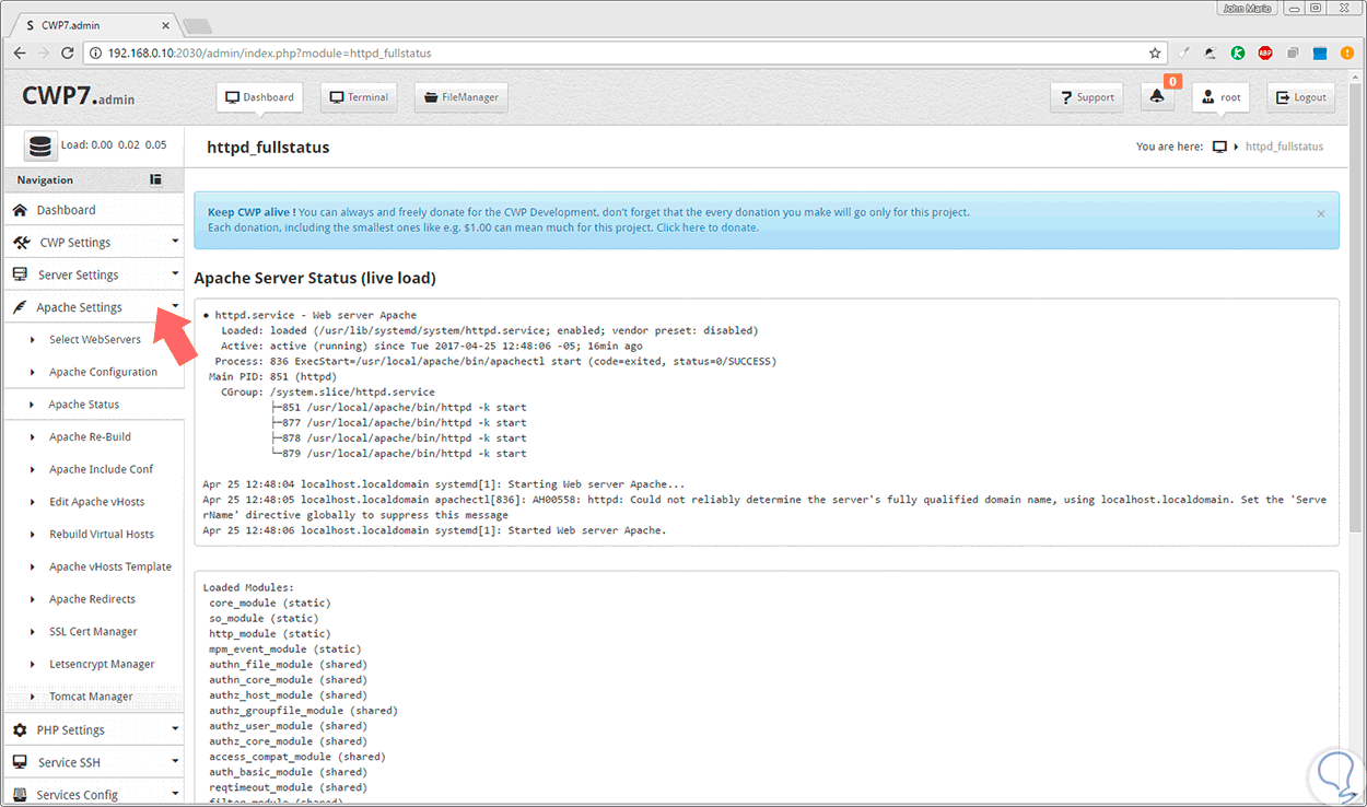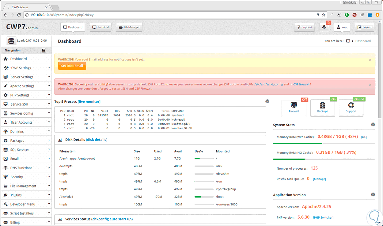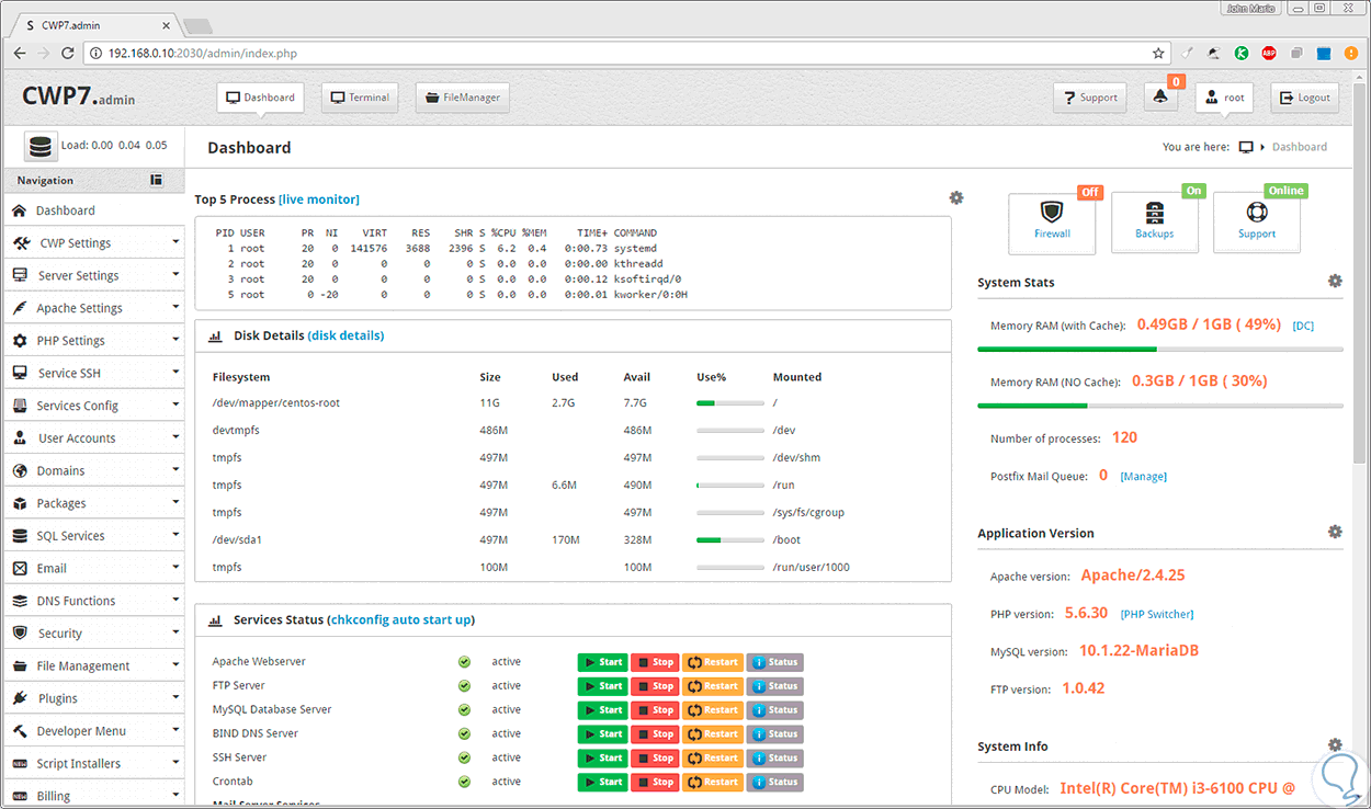 Como vemos es un panel bastante completo para la gestión sobre CentOS 7.