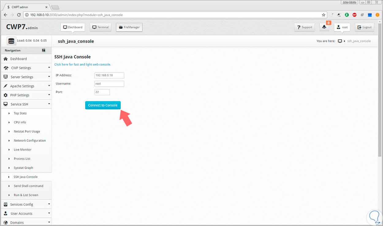 De esta forma tenemos muchas opciones de gestión del sistema operativo gracias a este panel web. Desde allí mismo podremos conectarnos a la terminal de forma remota pulsando en el botón Terminal ubicado en la parte superior. Pulsamos en Connect to Console para acceder.