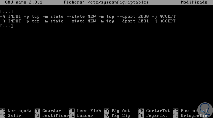 Para que la conexión sea correcta con el panel este usara los puertos 2030 (http) y 2013 (https) y estos debemos agregarlos al archivo iptables, para esto accedemos a la sigueinet5 ruta usando el editor preferido: