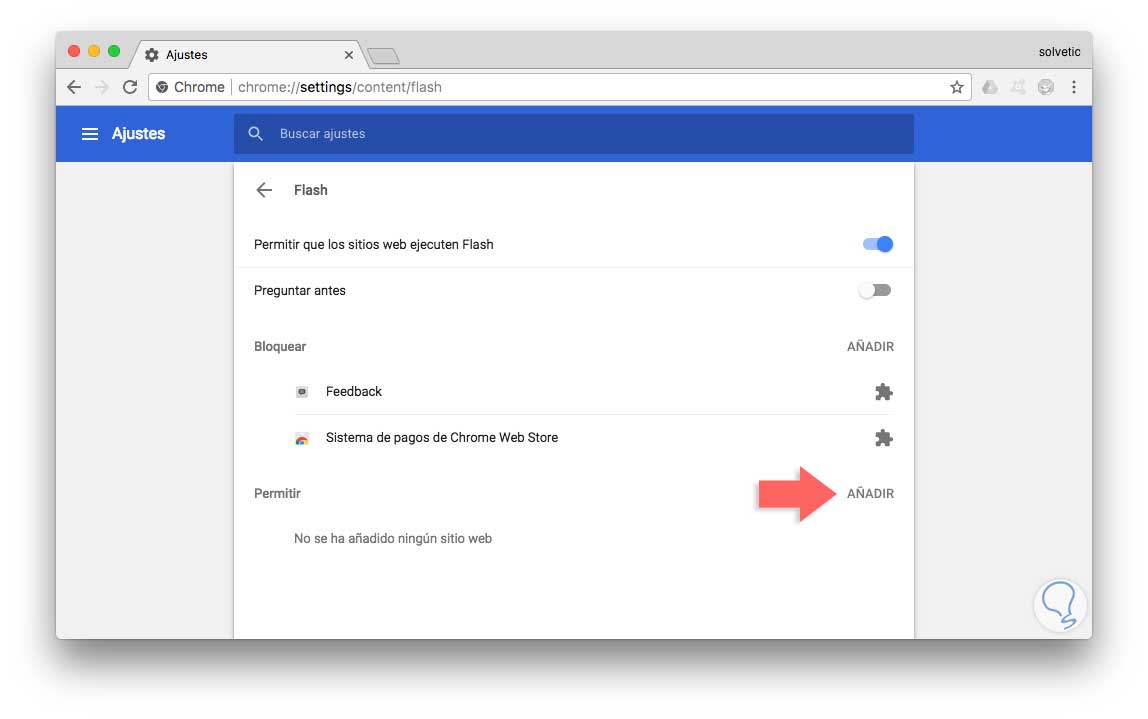 En el caso de que lo que quieras es permitir Flash en todos los sitios web con excepción de algunos, debemos seguir los siguientes pasos.