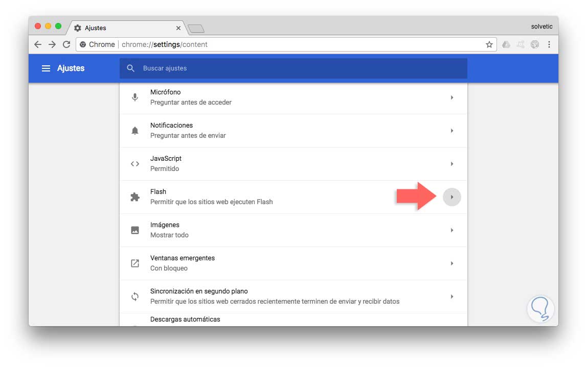 chrome://settings/content/flashEn la venta que se va a abrir, tenemos que dirigirnos a la sección de “Flash”