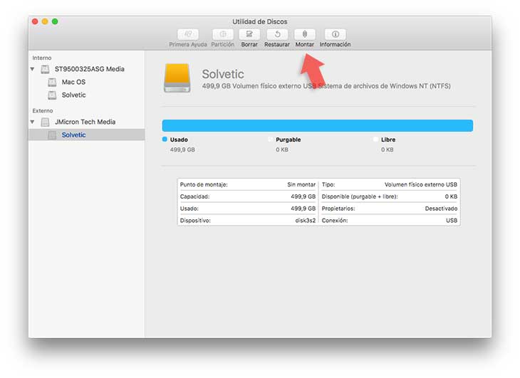 El siguiente paso consiste en comprobar si el volumen del disco externo está o no montando en macOS, para ello lo seleccionamos y si este está en gris pulsaremos en el botón Montar ubicado en la parte superior de la utilidad de discos: