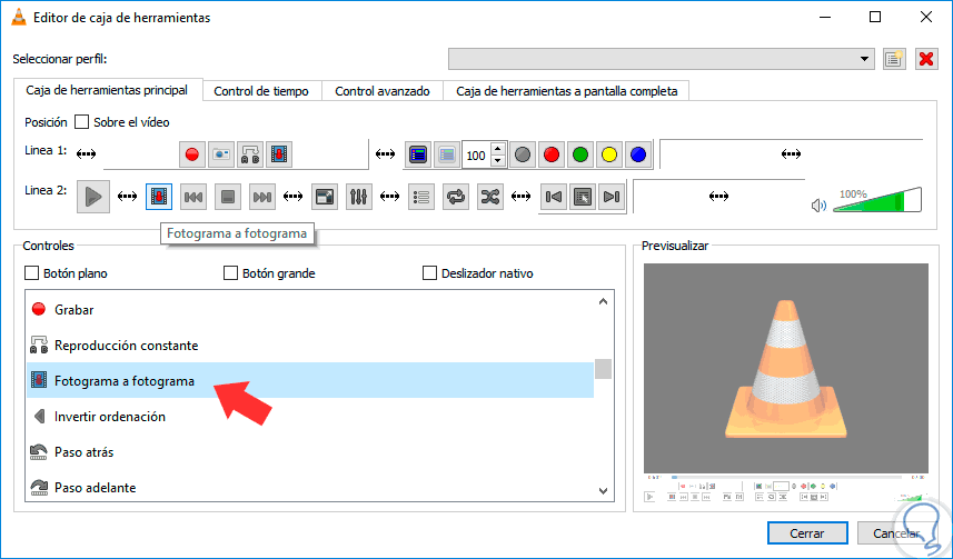 Esta es una de las opciones ofrecidas por VLC para la visualización de los fotogramas de un vídeo. La otra alternativa es usando un botón de la caja de herramientas y para acceder a esta opción vamos nuevamente a la pestaña "Preferencias / Personalizar interfaz". En la ventana desplegada debemos arrastrar el botón "Fotograma a Fotograma" a alguna posición de la línea 2: