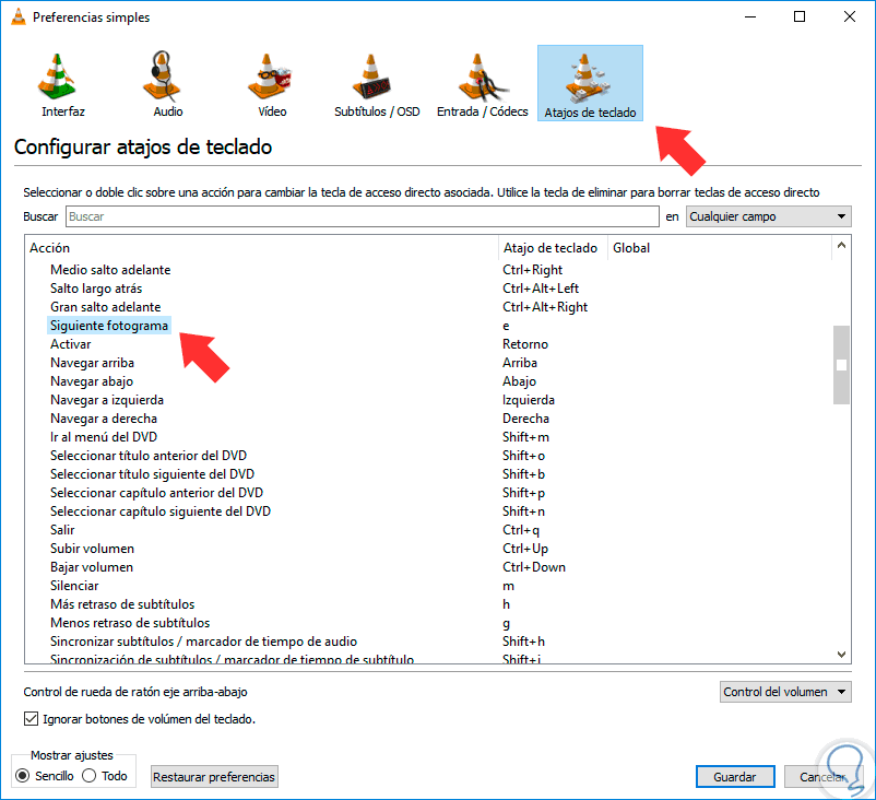 Se desplegará la siguiente ventana donde vamos a la pestaña “Atajos de teclado” y ubicamos la línea “Siguiente fotograma”: