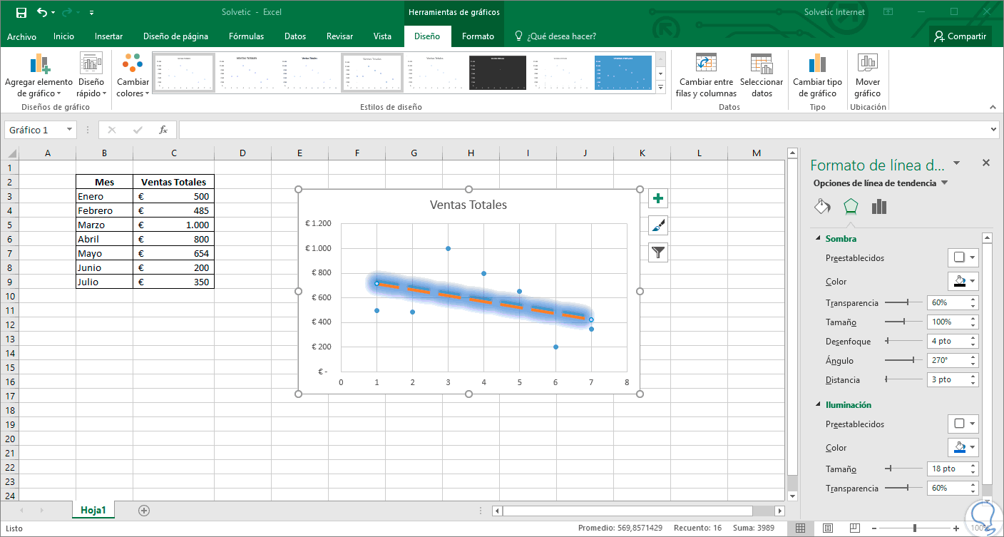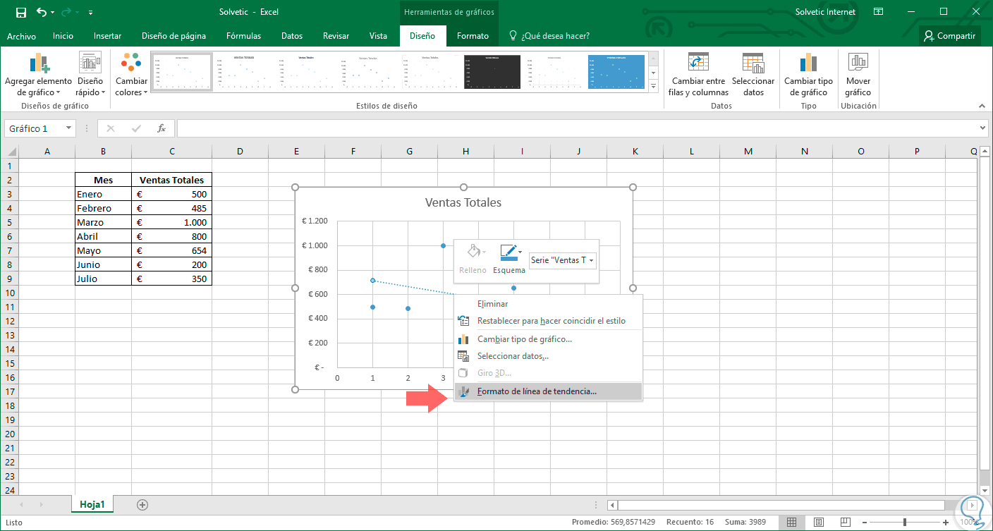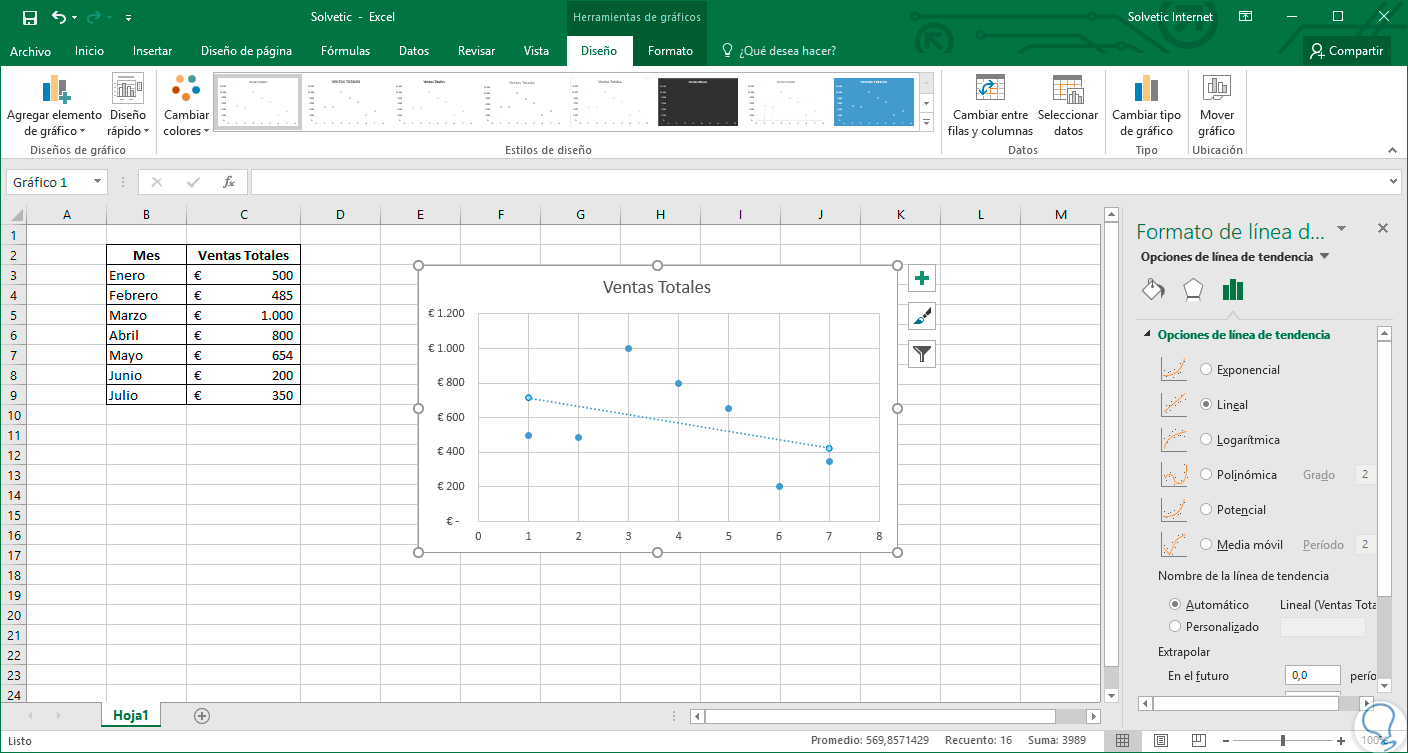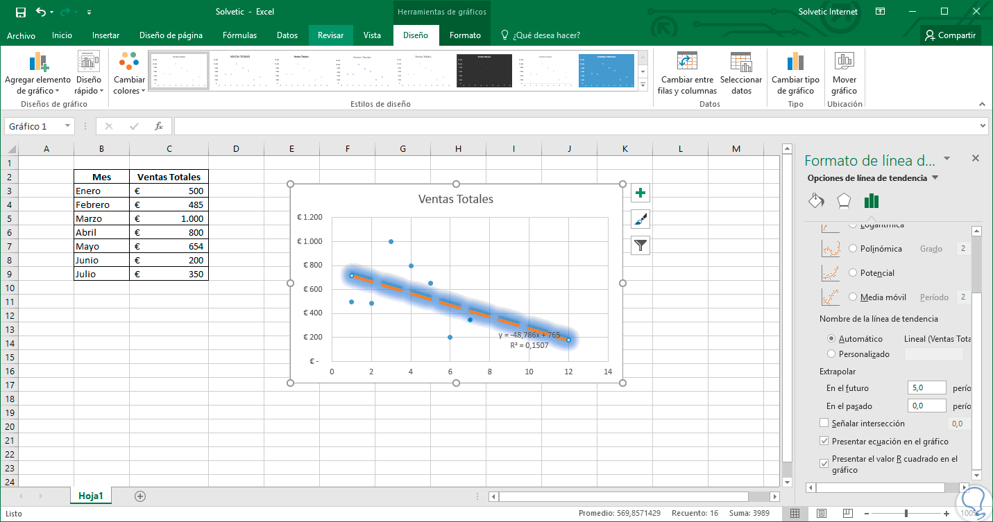 3. Formatear la línea de tendencia en Excel 2019 y Excel 2016