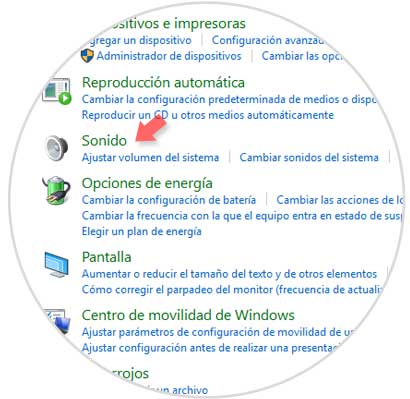 Allí pulsamos en la opción Hardware y sonido y veremos lo siguiente. Allí damos clic sobre la opción Sonido.