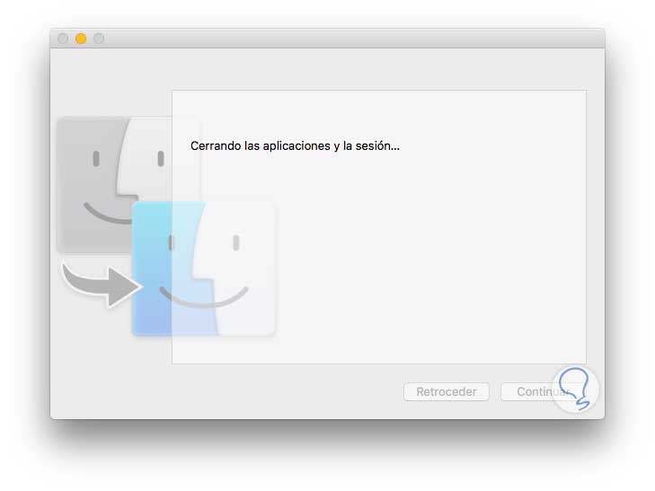 Allí encontramos la función de dicho asistente. Pulsamos en Continuar y de manera automática el asistente cerrara todas las aplicaciones y la sesión actual en macOS Sierra: