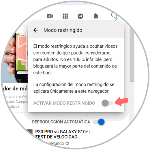 Por último, verás una nueva ventana emergente con una pestaña con la opción “Activar modo restringido”. Desliza la pestaña hacia la derecha y habrás activado el modo restringido. Si lo que quieres es desactivar la opción el proceso va a ser justo el contrario. Sigue los pasos anteriores y desliza la pestaña hacia la izquierda para desactivar la opción en YouTube en tu PC.