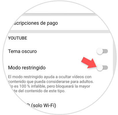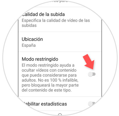 Al final del listado verás la opción “Modo restringido”. Desliza la pestaña hacia la derecha para activarla o hacia la izquierda para desactivarla y habrás terminado.