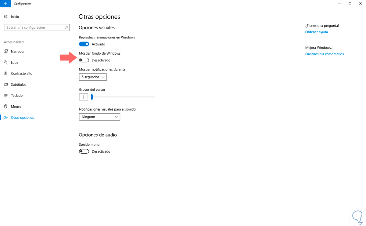 En la ventana que se desplegara debemos pulsar sobre el interruptor Mostrar fondo de Windows para que su estado pase a desactivado: