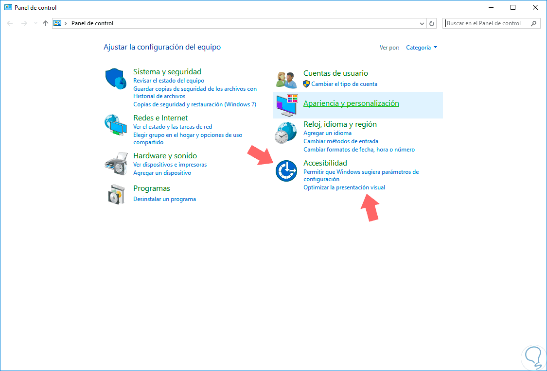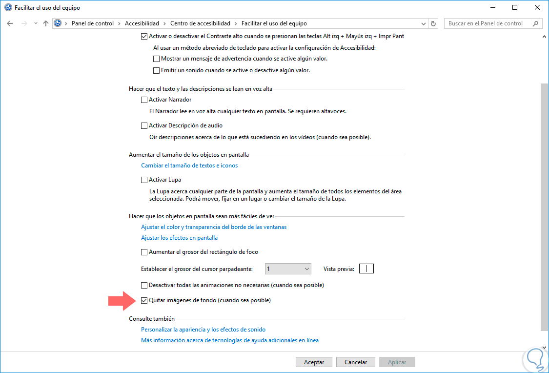 Allí seleccionamos la opción Optimizar la presentación visual ubicada en el campo Accesibilidad y veremos la siguiente ventana: