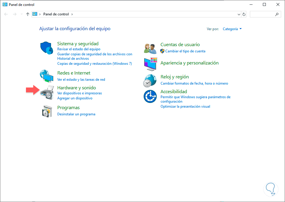 Ahora seleccionaremos la opción de “Hardware y sonido” pulsado sobre ella.