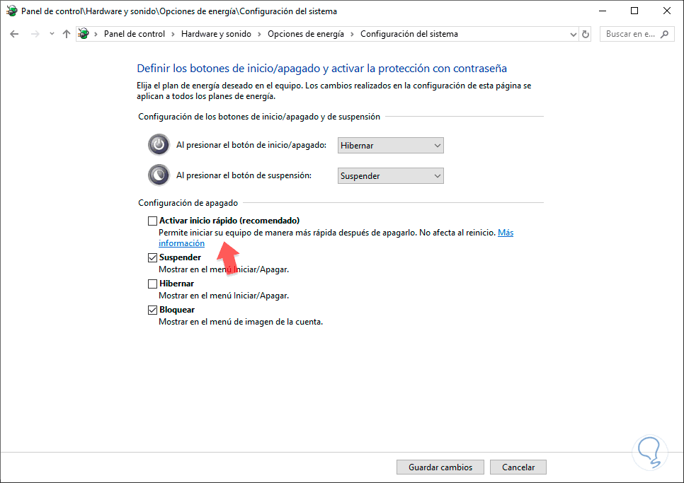 Ahora ya podremos modiciar las diferentes opciones y deshabilitar la opción de “Activar inicio rápido (recomendado)”