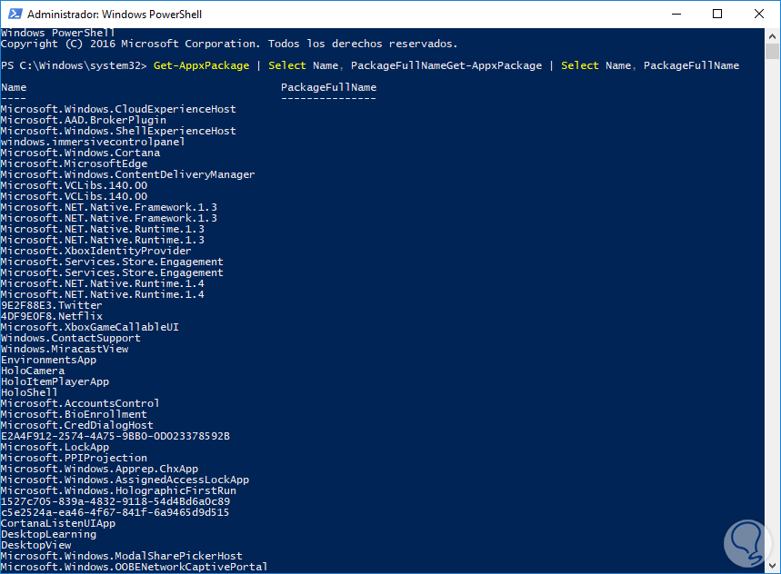 Get-AppxPackage | Select Name, PackageFullNameEl resultado será el siguiente: