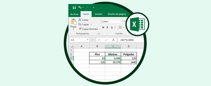 - =B3*12 para calcular cuántos pies tiene una pulgada.