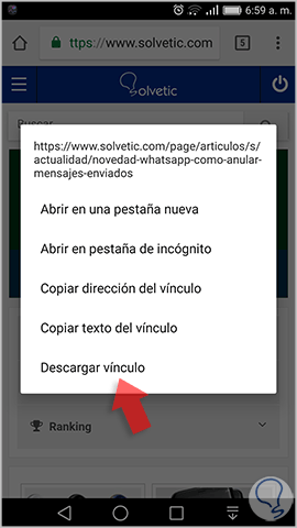 Allí pulsamos en la opción Descargar vinculo y el enlace se guardará automáticamente en la carpeta Descargas de Google Chrome.