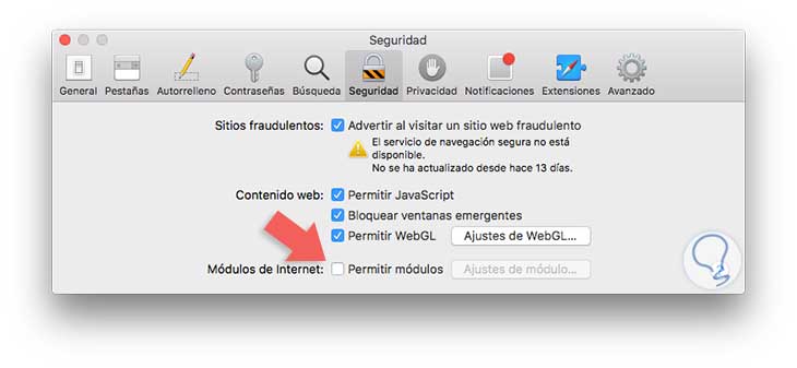 Allí desactivaremos la casilla Permitir módulos ubicada en el campo Módulos de Internet: