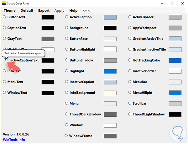 Al momento de ejecutar la aplicación se preguntará si deseamos guardar una copia de respaldo de la configuración actual de colores, es importante en caso de algún error poder contar con la configuración inicial de Windows 10. Al acceder a Classic Color Panel veremos la siguiente ventana:
