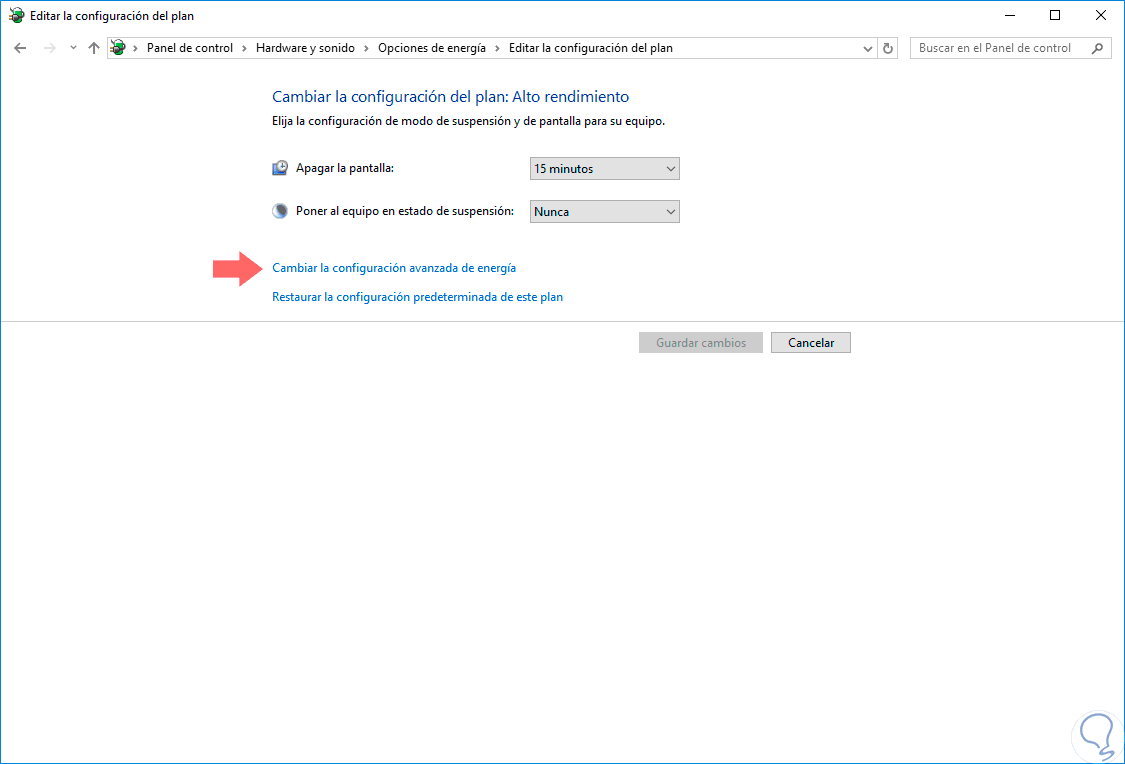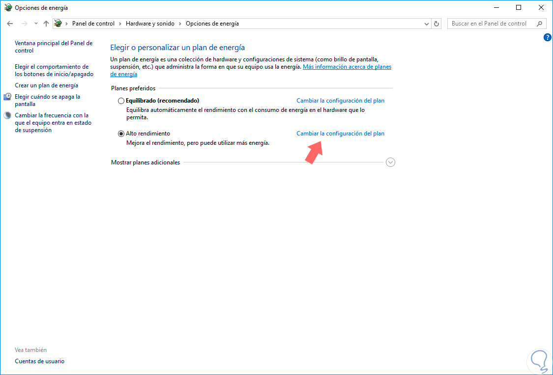 Pulsamos en la línea Cambiar la configuración del plan para acceder a sus parámetros: