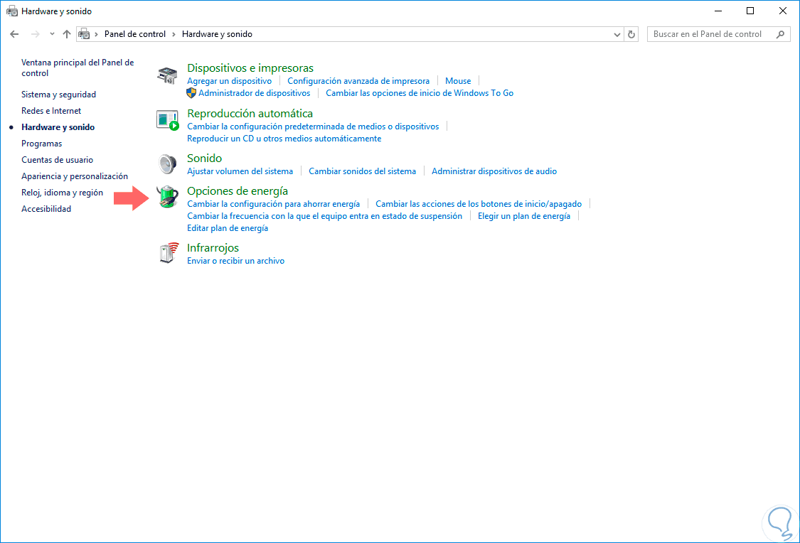 A continuación seleccionamos la línea Opciones de energía donde veremos la configuración actual a nivel de plan de energía en Windows 10: