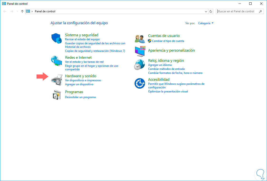 Allí pulsamos en la opción Hardware y sonido y veremos lo siguiente: