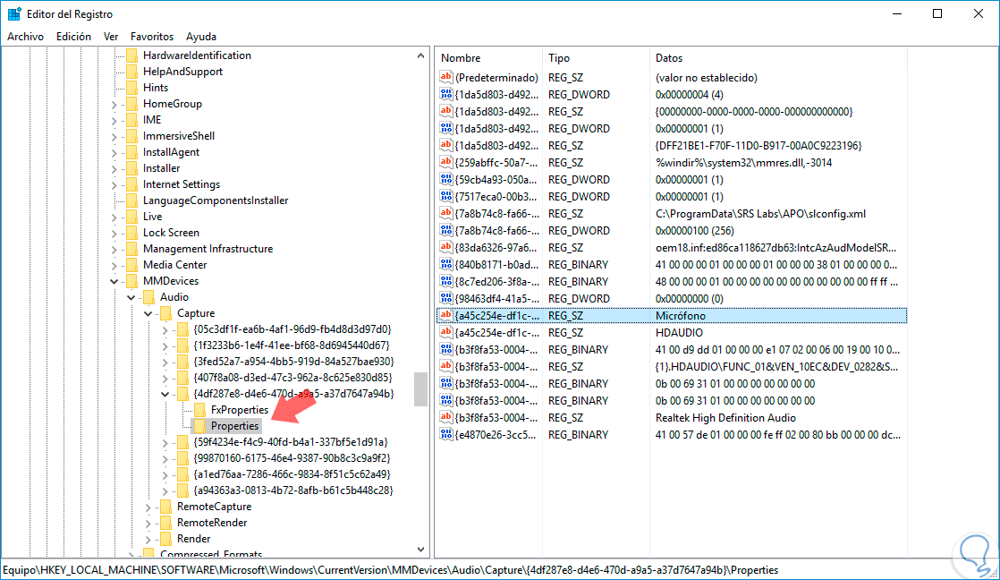 Desplegamos las opciones de Captura y en los registros debemos ubicar el que contenga la opción Micrófono, para ello desplegamos cada registro y seleccionamos la carpeta Properties y en el costado derecho veremos la respectiva información: