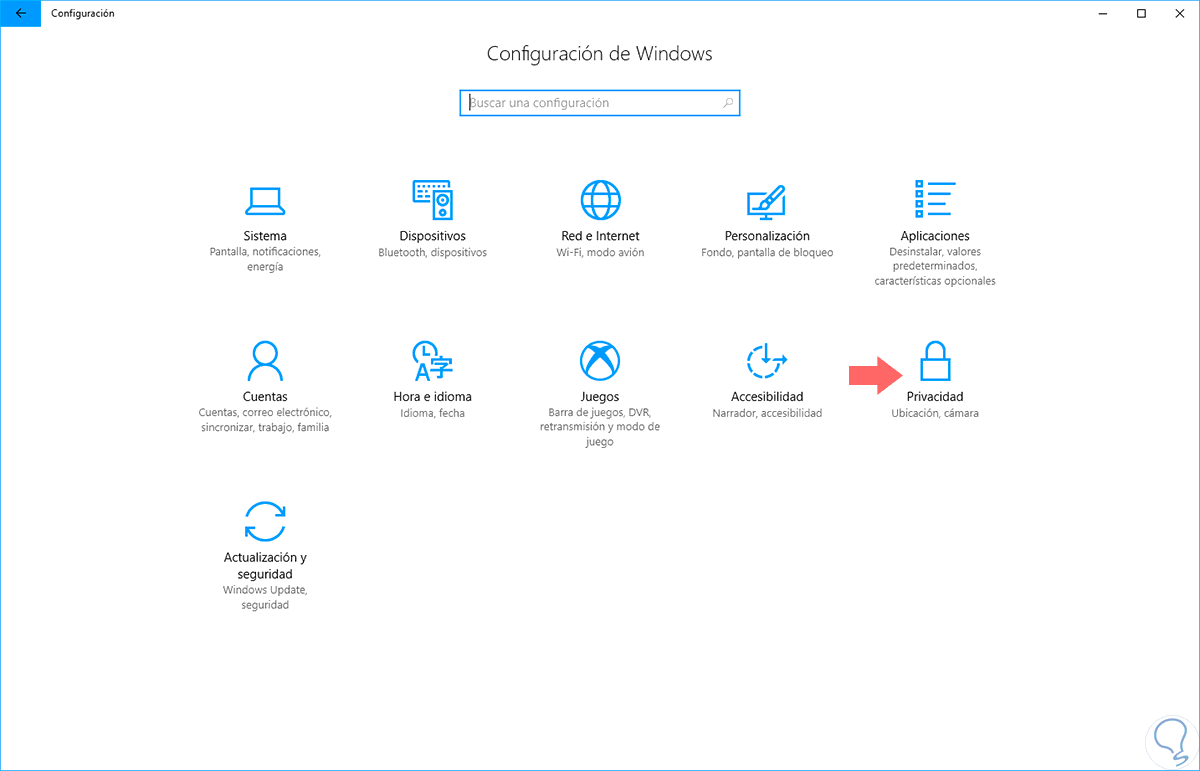 Para usar este método vamos al menú Inicio y allí seleccionamos la opción Configuración, se desplegará lo siguiente: