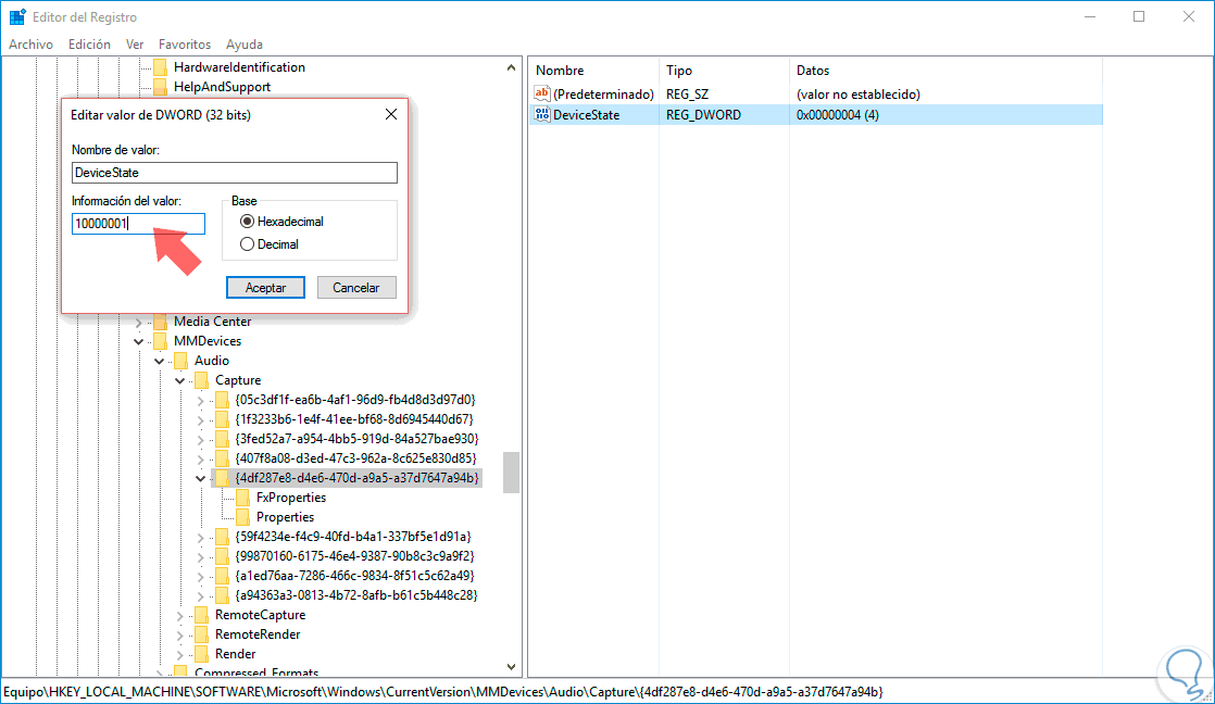 Al determinar cuál es el registro correcto, damos clic en la clave de dicho registro y editamos el registro DeviceState ubicado en el panel central. Allí tenemos la opción de agregar alguno de estos valores. Pulsamos en Aceptar y podemos cerrar el editor de registros de Windows 10.