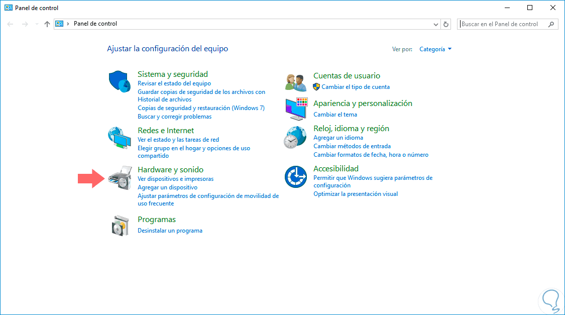 Allí seleccionamos la opción Hardware y sonido y en la siguiente ventana seleccionaremos Sonido.