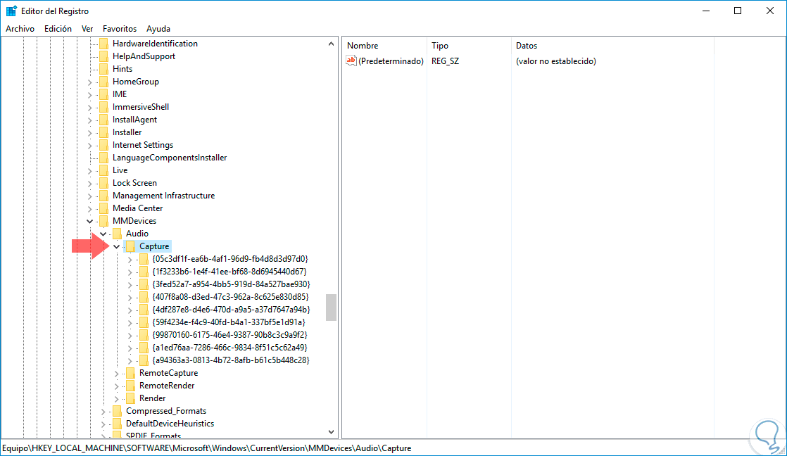 Hola. Sabes que hace unos días una niñita amiga de mi sobrina estuvo usando la laptop y la desconfiguró. Uno de los cambios que hizo fue que el micrófono ya no se puede usar. Seguí todos los pasos del primero al último y al final, al revisar el registro, comprobé que no hay NINGUNA CLAVE, no hay nada para configurar. El registro hasta alí llega a Capture, y dentro solo se encuentra el valor predeterminado que no está establecido, nada más que eso. Por favor ayúdame.