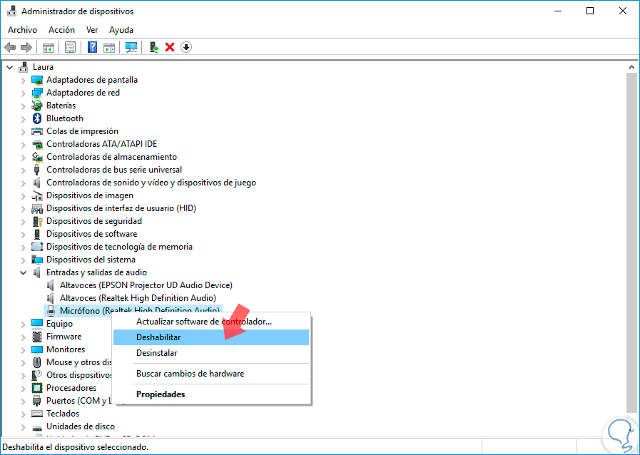 En la ventana desplegada vamos a la línea Entradas y salidas de audio y de las opciones desplegadas damos clic derecho sobre la opción Micrófono y seleccionamos la opción Deshabilitar o habilitar en función de lo que queramos: