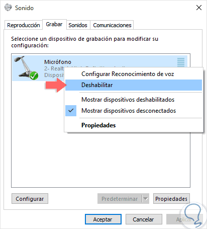 En la nueva ventana vamos a la pestaña Grabar y allí daremos clic derecho sobre la opción de Micrófono y seleccionaremos Deshabilitar o habilitar según queramos: