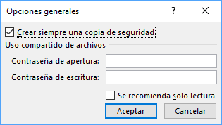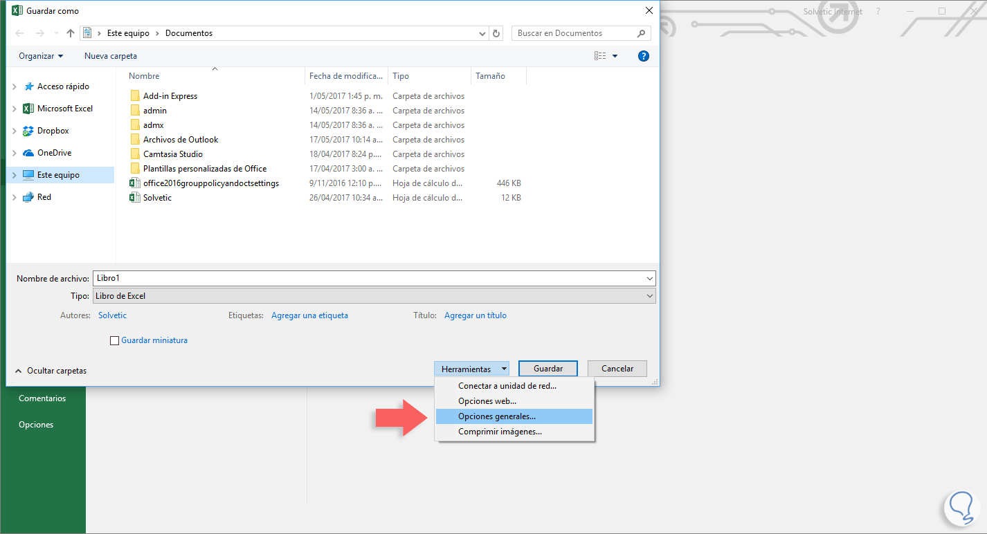 Para esta configuración, en cualquier edición de Excel, vamos al menú Archivo / Guardar como, pulsamos en la opción Examinar y una vez sea desplegada la ventana para seleccionar el destino pulsamos en la opción Herramientas ubicada en la parte inferior y allí seleccionamos Opciones generales: