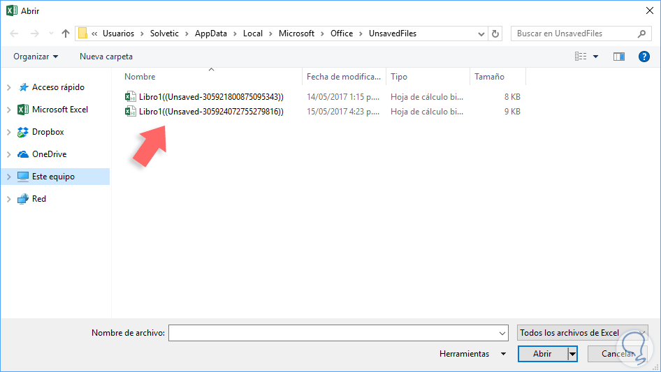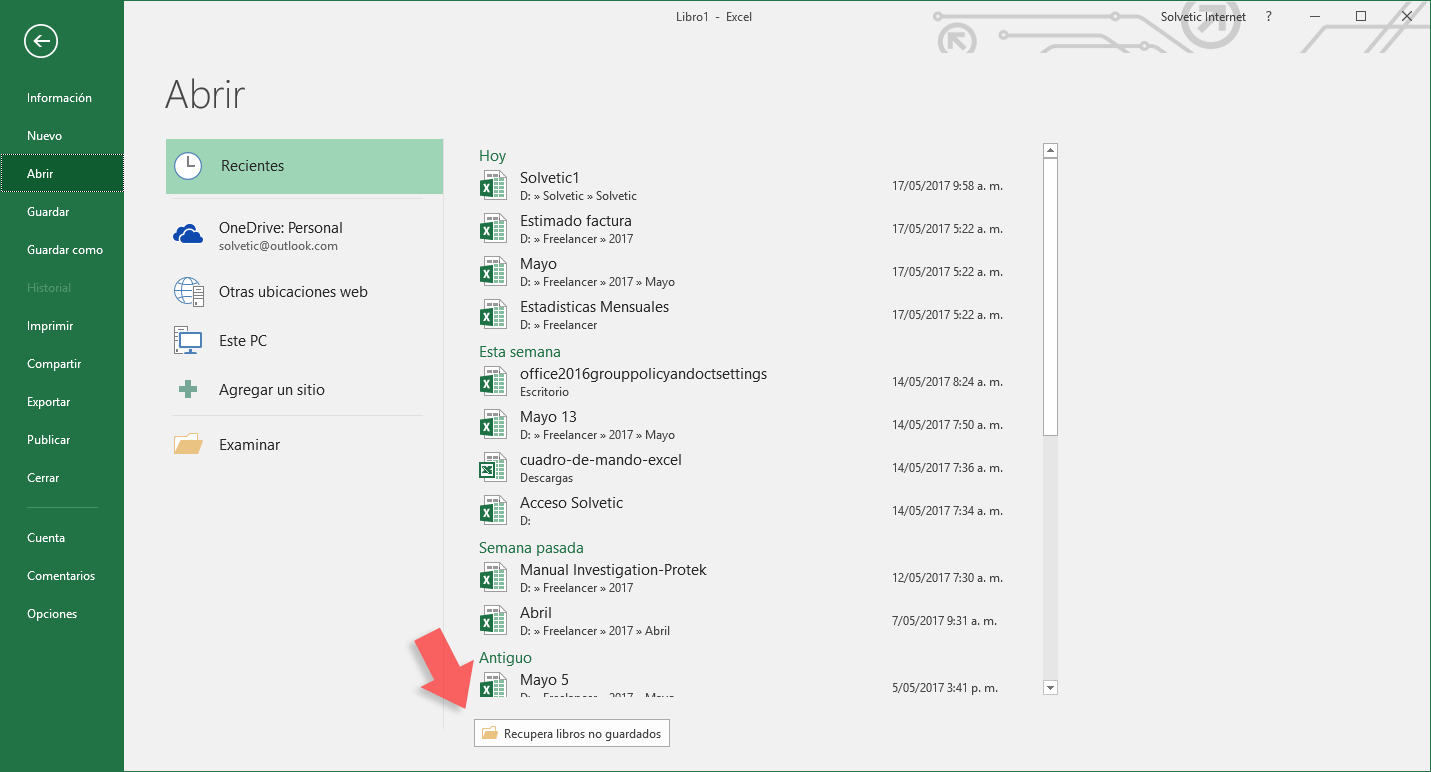Allí pulsamos en la opción Recuperar libros no guardados y se desplegará la siguiente ventana: